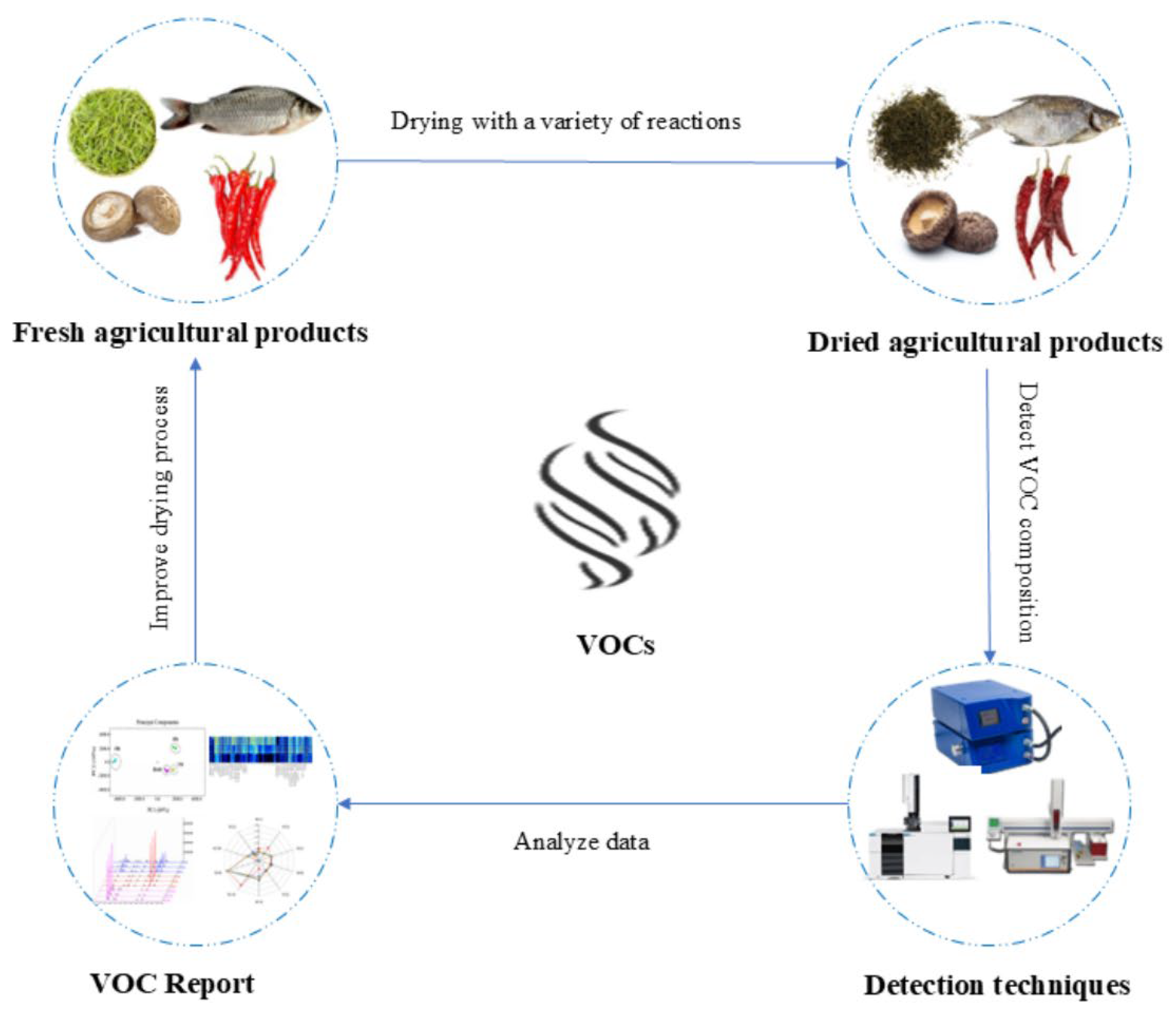 Chen, P.; Zhao, S.; Li, C.; Zhang, T.; Xing, Y.; Zhang, K.; Lv, J.; Zhu, W. Changes and Analytical Techniques in Volatile Flavor Compounds in Dried Agricultural Products: A Review. Foods 2025, 14, 3531. https://doi.org/10.3390/foods14203531