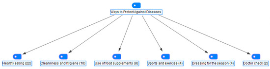In the study, semi-structured interview notes were analyzed using MAXQDA software. Figure 1 shows that parents attempt to protect their children from diseases by employing various methods. The prevention methods frequently mentioned by the parents in the interviews were healthy nutrition (44%), cleanliness and hygiene (20%), use of food supplements (16%), sports and exercise (8%), seasonal dressing (8%), and doctor control (4%).