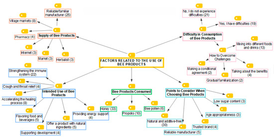 Figure 2 illustrates that parents’ opinions on the use of bee products for their children were categorized into five groups. These categories include: consumption of bee products, intended use of bee products, considerations for preferring bee products, difficulties in consuming bee products, and the supply of bee products.