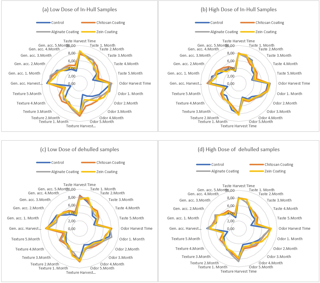 Similarly, the differences between odor results of coating materials were not significant at the beginning of the storage. However, alginate came to the fore from the third month of the storage in in-hull low-dose samples and also the fourth month of the storage in low- and high-dose of dehulled samples (p < 0.05).