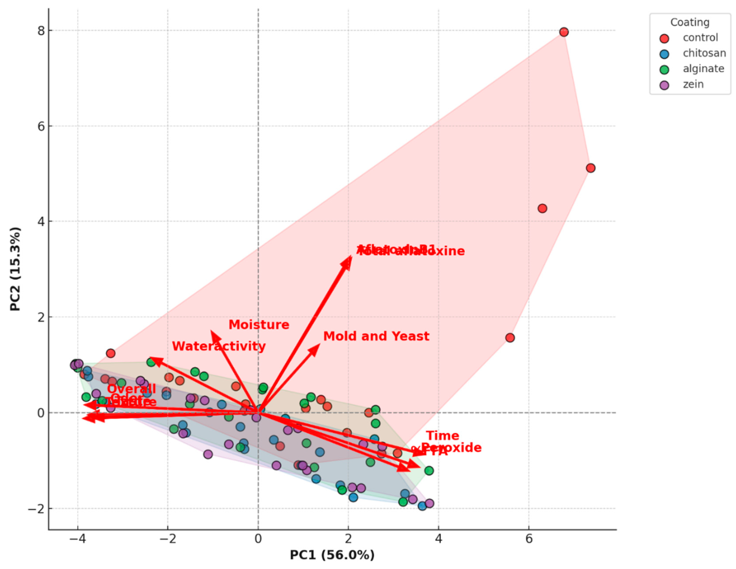 PCA analyses indicated that chitosan and alginate coatings had the best storage performance by maintaining product quality and preventing spoilage. However, control samples showed the worst performance in terms of spoilage and mold and yeast growth. While zein coating performed better storage stability than the control samples, the effectiveness of zein coating may be more variable than chitosan and alginate coatings.