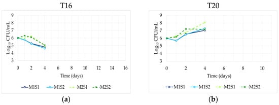 The trend of the S. cerevisiae counts in the T16 and T20 trials is shown in Figure 2c and Figure 2d, respectively. After inoculating S. cerevisiae at 16 °C in control trials (S1 and S2), yeast cell counts initially declined, then recovered to approximately 5 log CFU/mL, maintaining stable levels through the end of fermentation. This behavior is consistent with previously observed population dynamics under similar winemaking conditions [49].