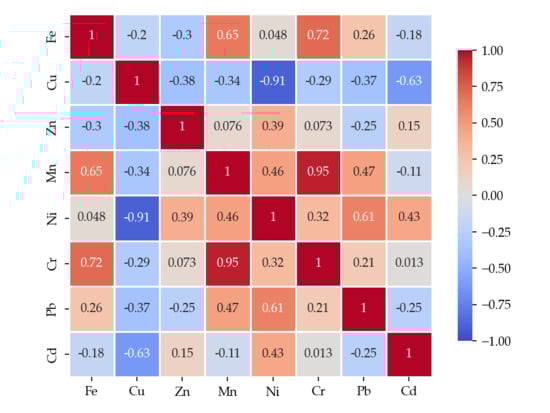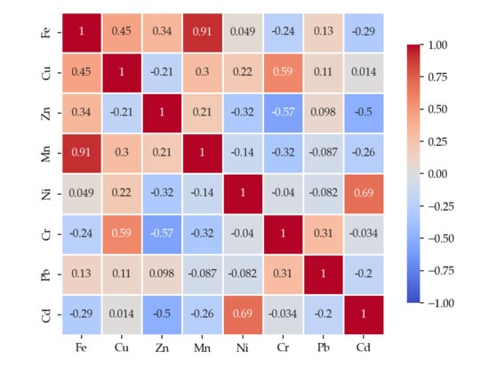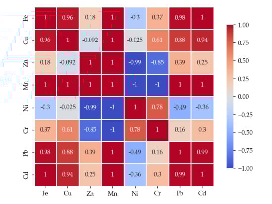 To assess the relationships between metals determined in the wild mushroom samples studied, Pearson correlation analysis was performed using Python 3.10.9, and the obtained correlation matrix is presented in Figure 2, Figure 3 and Figure 4.