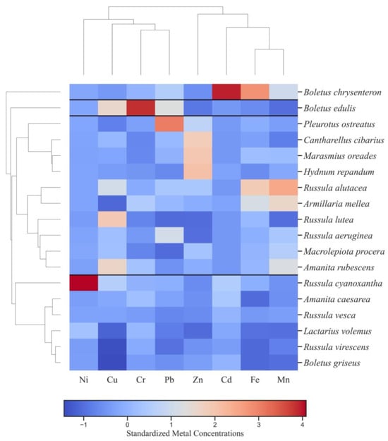 The hierarchical cluster map presented in Figure 5 illustrates the grouping of mushroom species according to the similarity of their standardized metal concentrations [70]. Color gradients represent standardized values, where red shades denote above-mean concentrations and blue shades indicate below-mean values, while black horizontal lines delineate the distinct clusters.