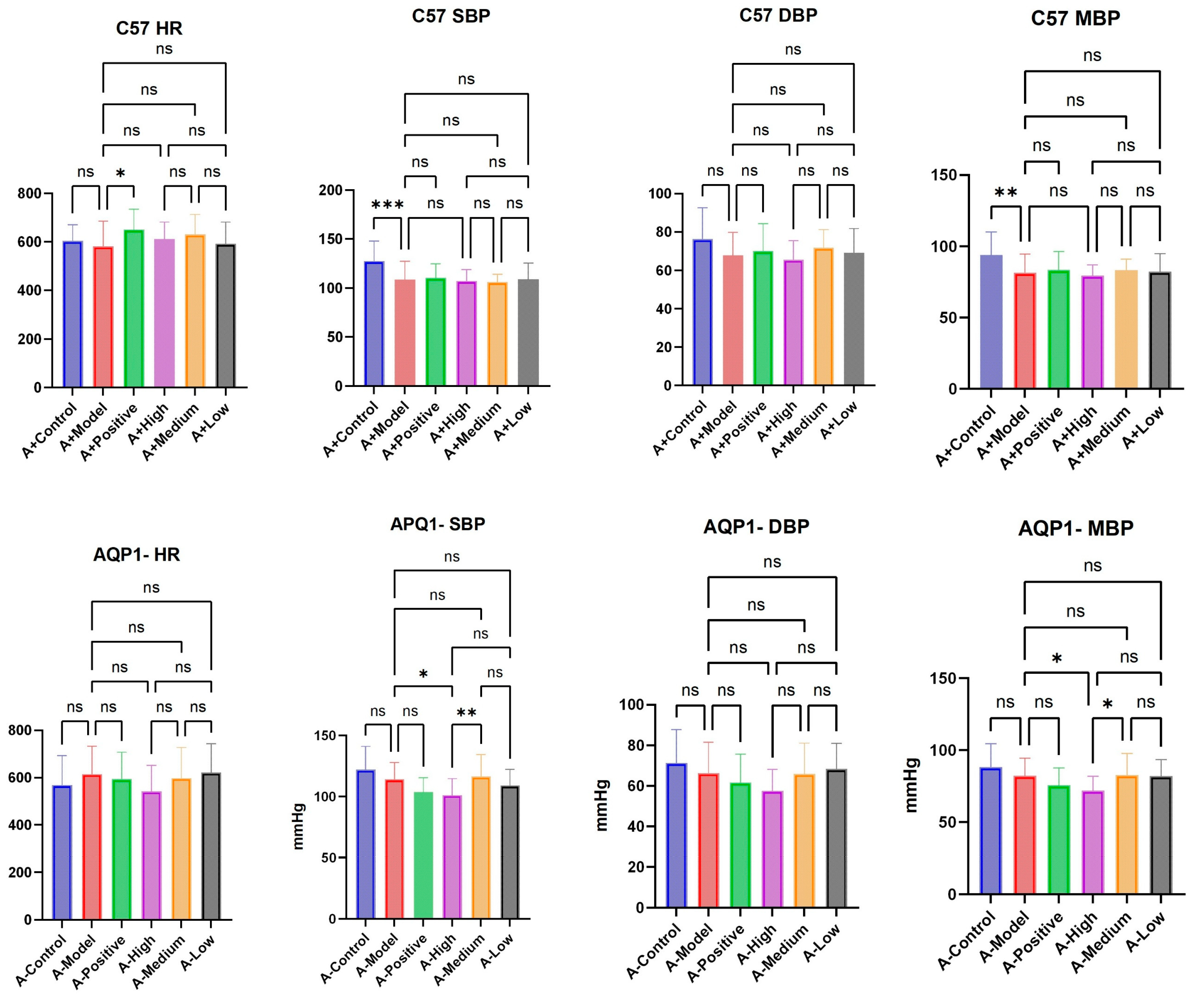 In the C57 group, the establishment of a heart failure model resulted in significant differences in SBP (systolic blood pressure) and MBP (mean blood pressure), but in the AQP1 knockout group, there was no difference between the heart failure model and the normal group. The treatment groups of both groups of mice did not have a significant effect on HR (heart rate), SBP, MBP, or DBP (diastolic blood pressure) (