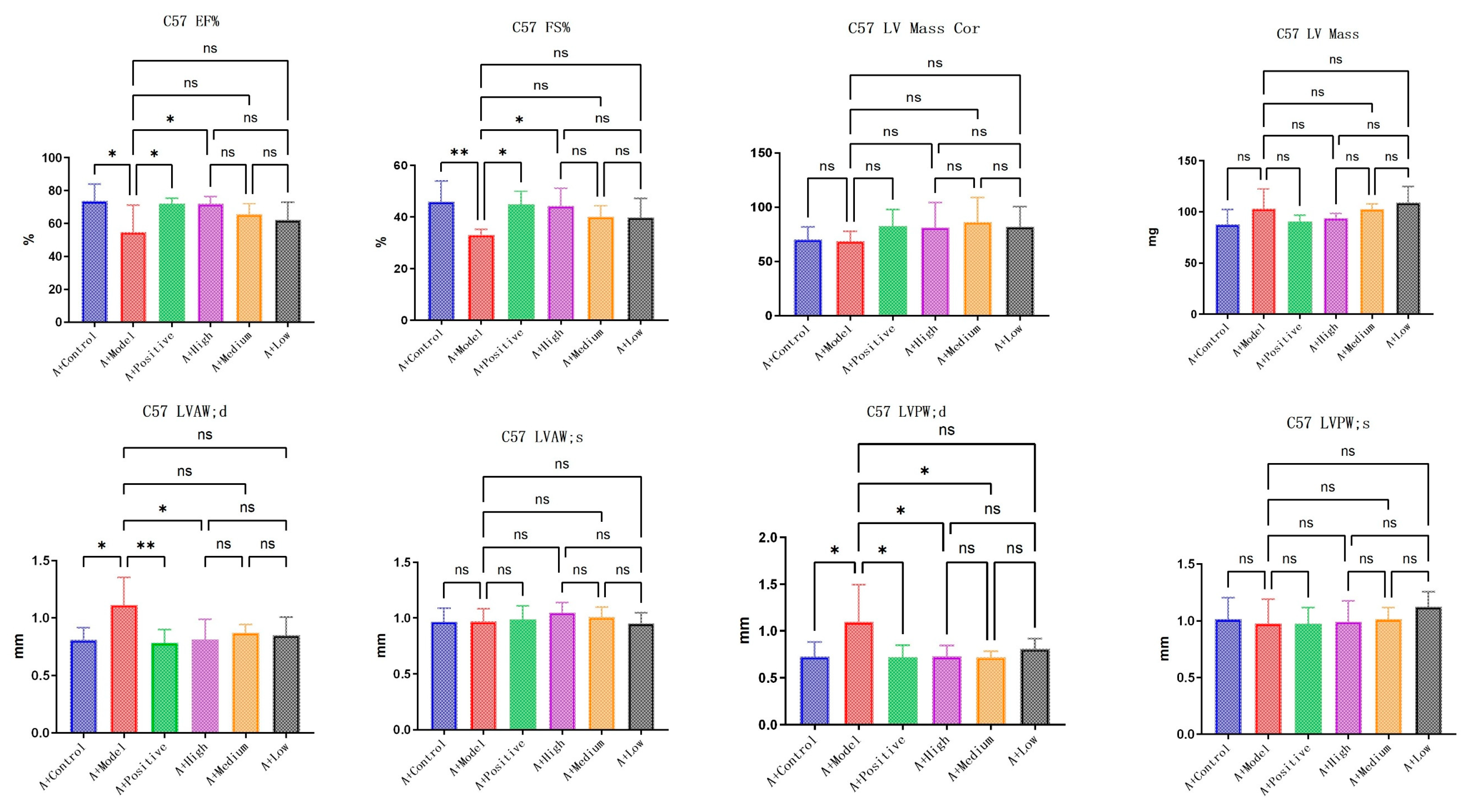 p < 0.05) in the model group compared to the normal group, which is consistent with characteristic changes in heart failure. Compared to the model group, the high-dose LA&ALA group exhibited significant improvements in EF%, FS%, LVAW;d, and LVPW;d, with statistically significant differences (