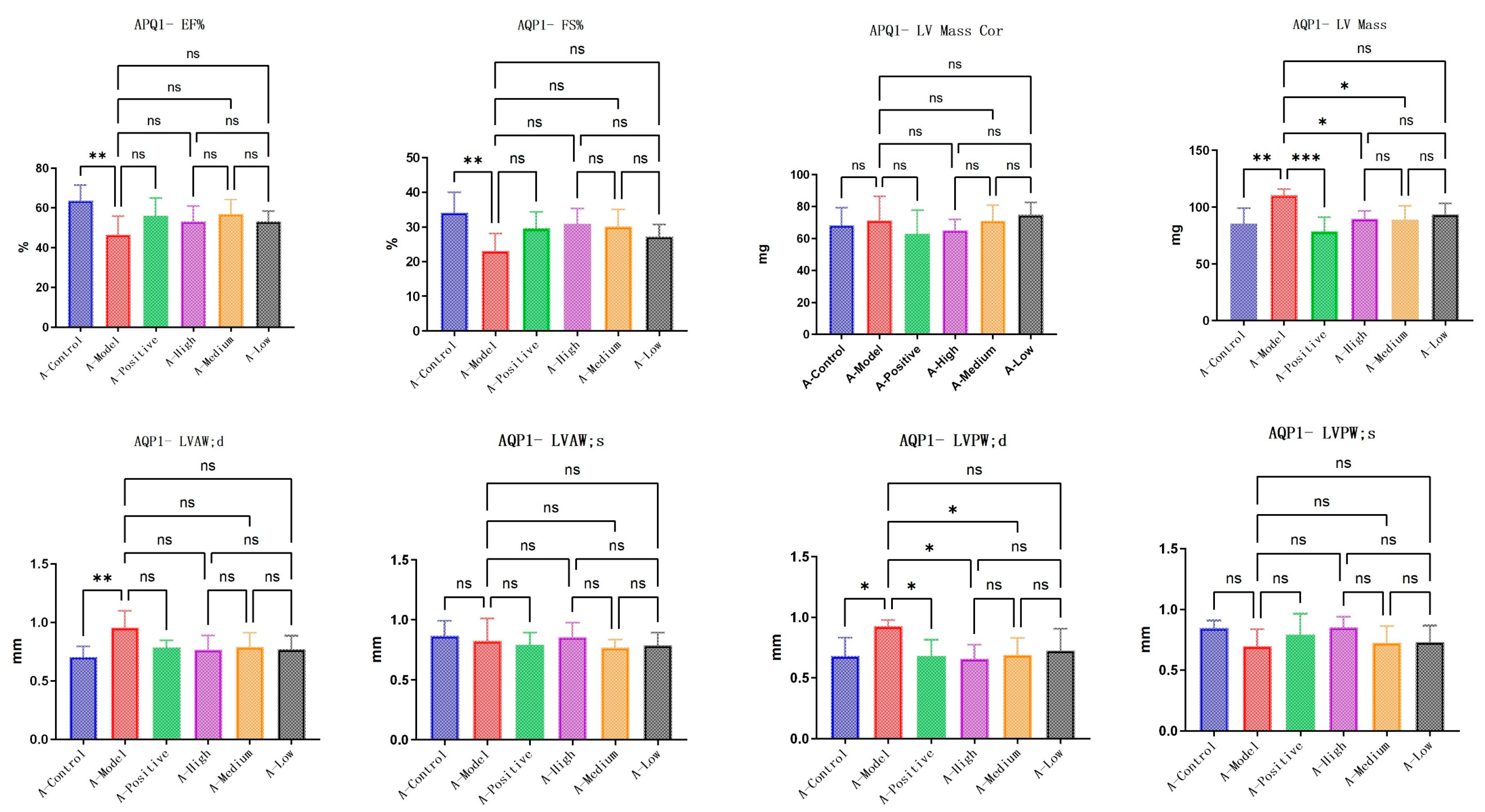p > 0.05). It is also noteworthy that AQP1 knockout led to a significant increase in LV Mass, while no notable difference was found in LV Mass Cor (left ventricular mass corrected). These results suggest that the heart failure model exacerbates myocardial fluid retention and that AQP1 is highly involved in this process, consistent with previous studies. Furthermore, AQP1 knockout did not appear to affect the improvement in LVPW;d, as a significant difference remained between the treatment and model groups (