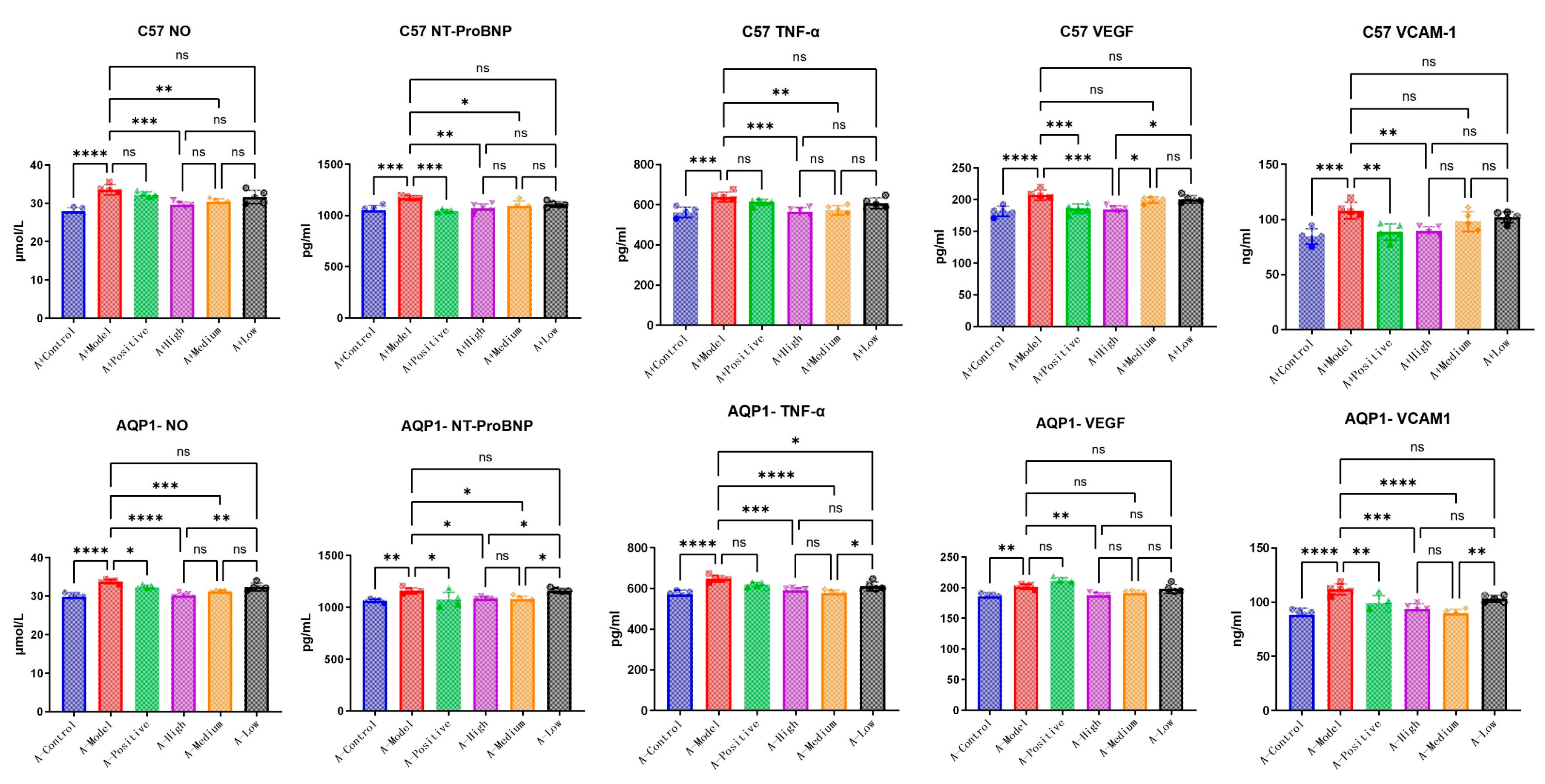 The ELISA results confirm that LA and ALA not only improve cardiac function in chronic heart failure but also exert vascular protective effects by reducing inflammatory cytokines, inhibiting NO overproduction, and decreasing serum levels of VEGF and VCAM-1. Importantly, the pharmacological reductions in VEGF, VCAM-1, and NO appear to be independent of AQP1, suggesting that LA&ALA may act through multiple parallel mechanisms. For instance, its anti-inflammatory and endothelium-stabilizing effects may involve alternative signaling pathways such as NF-κB inhibition or PI3K/Akt activation. These findings highlight the complex and multifaceted mechanism of action underlying LA and ALA’s cardioprotective effects.