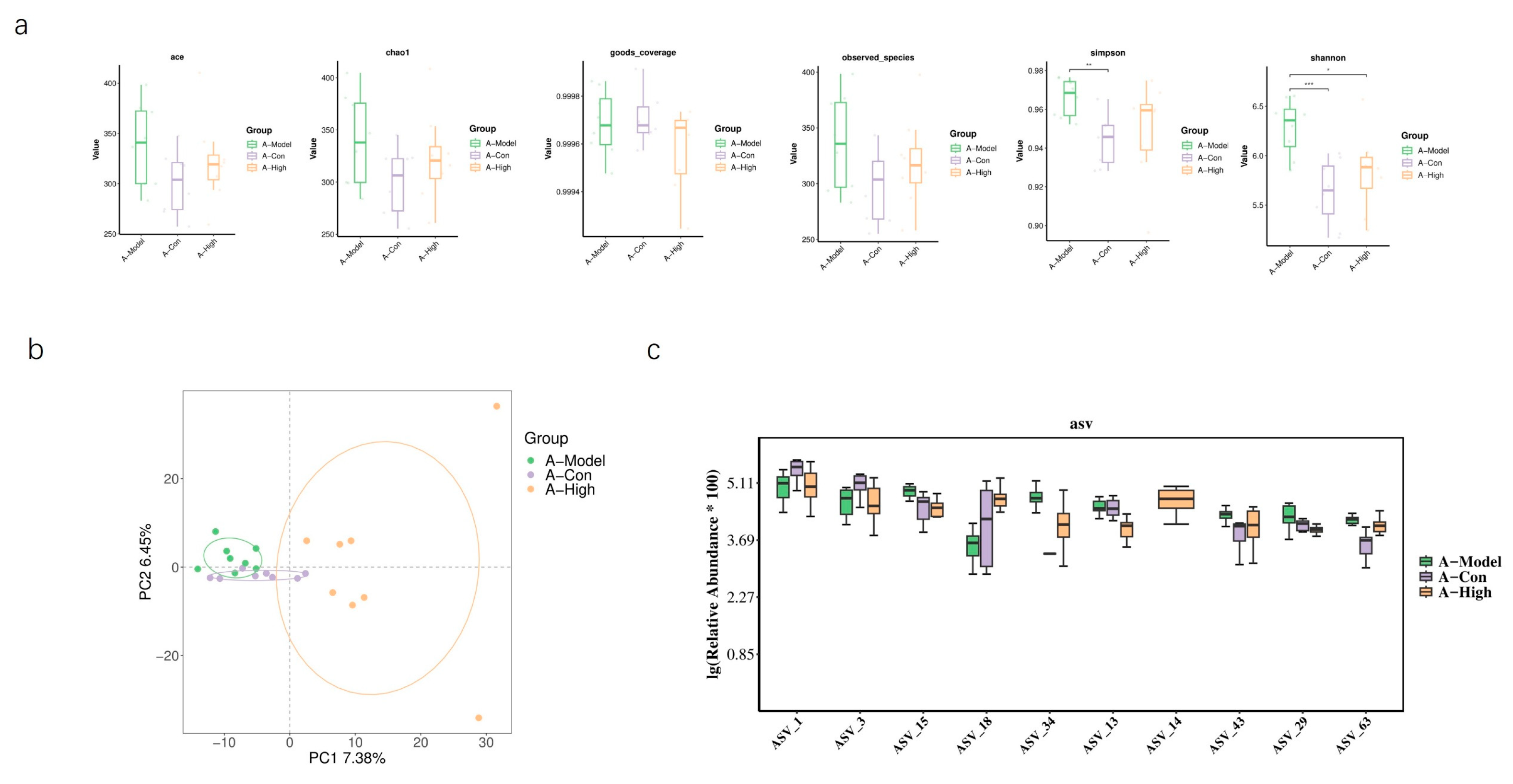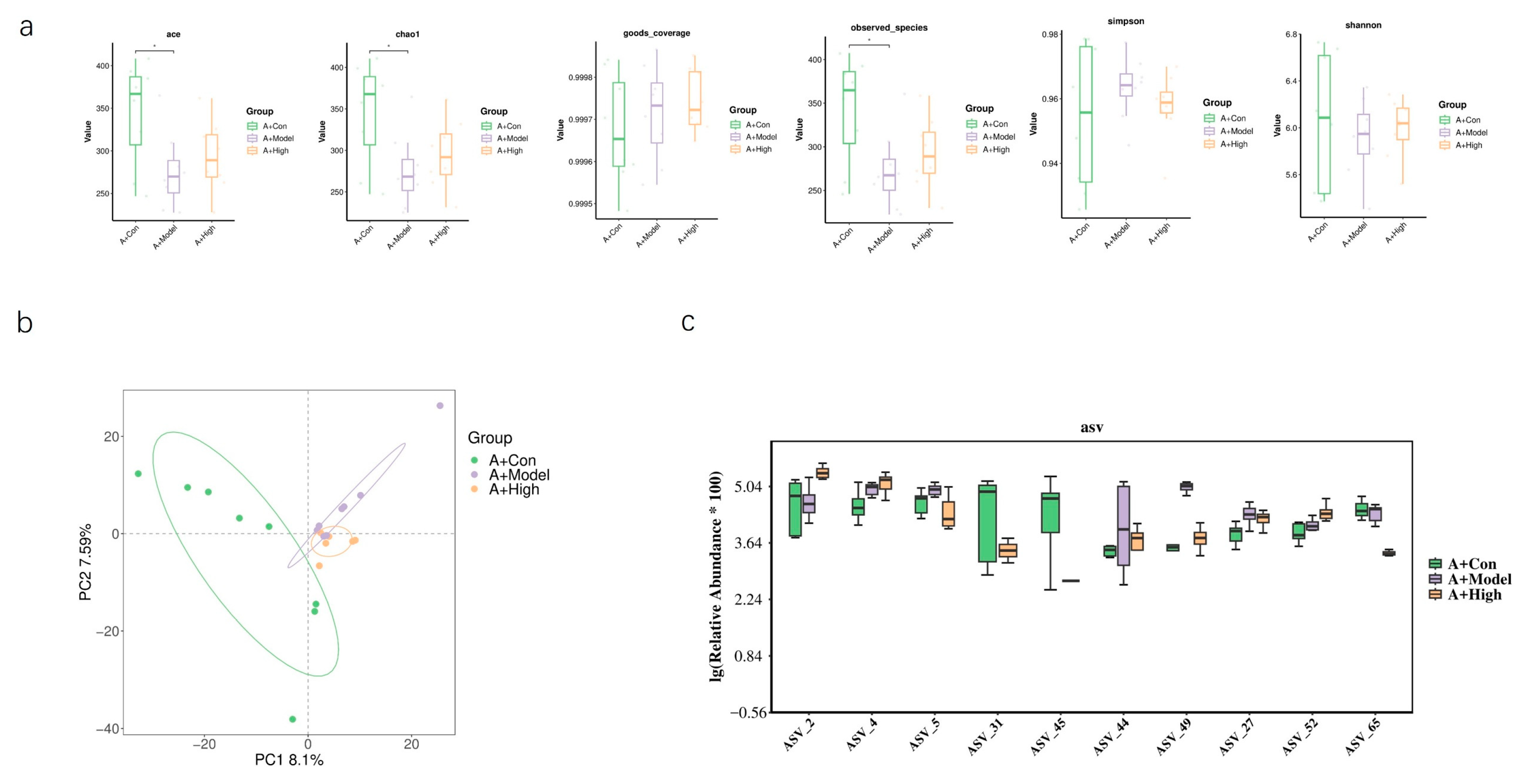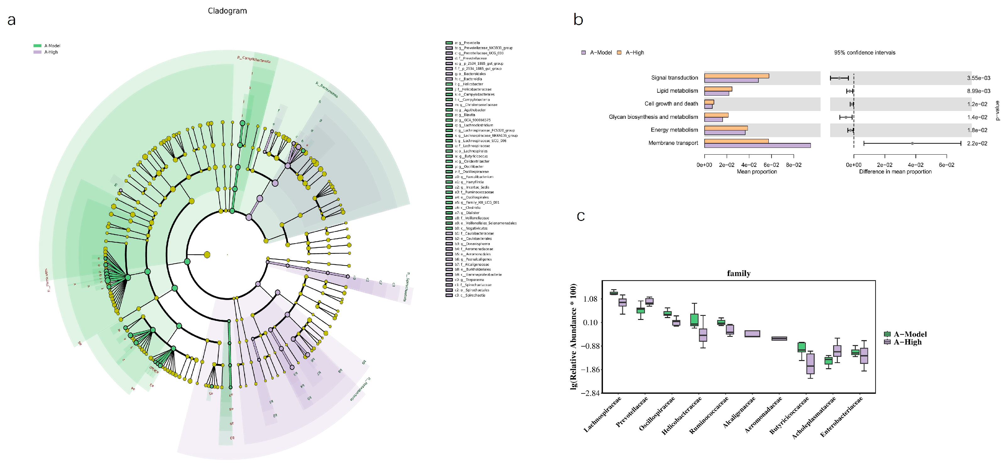 − mice, alpha diversity indices indicated a significant difference in microbial community structure between the high-dose group and the model group. Differential abundance analysis highlighted significant changes in bacteria belonging to the families
