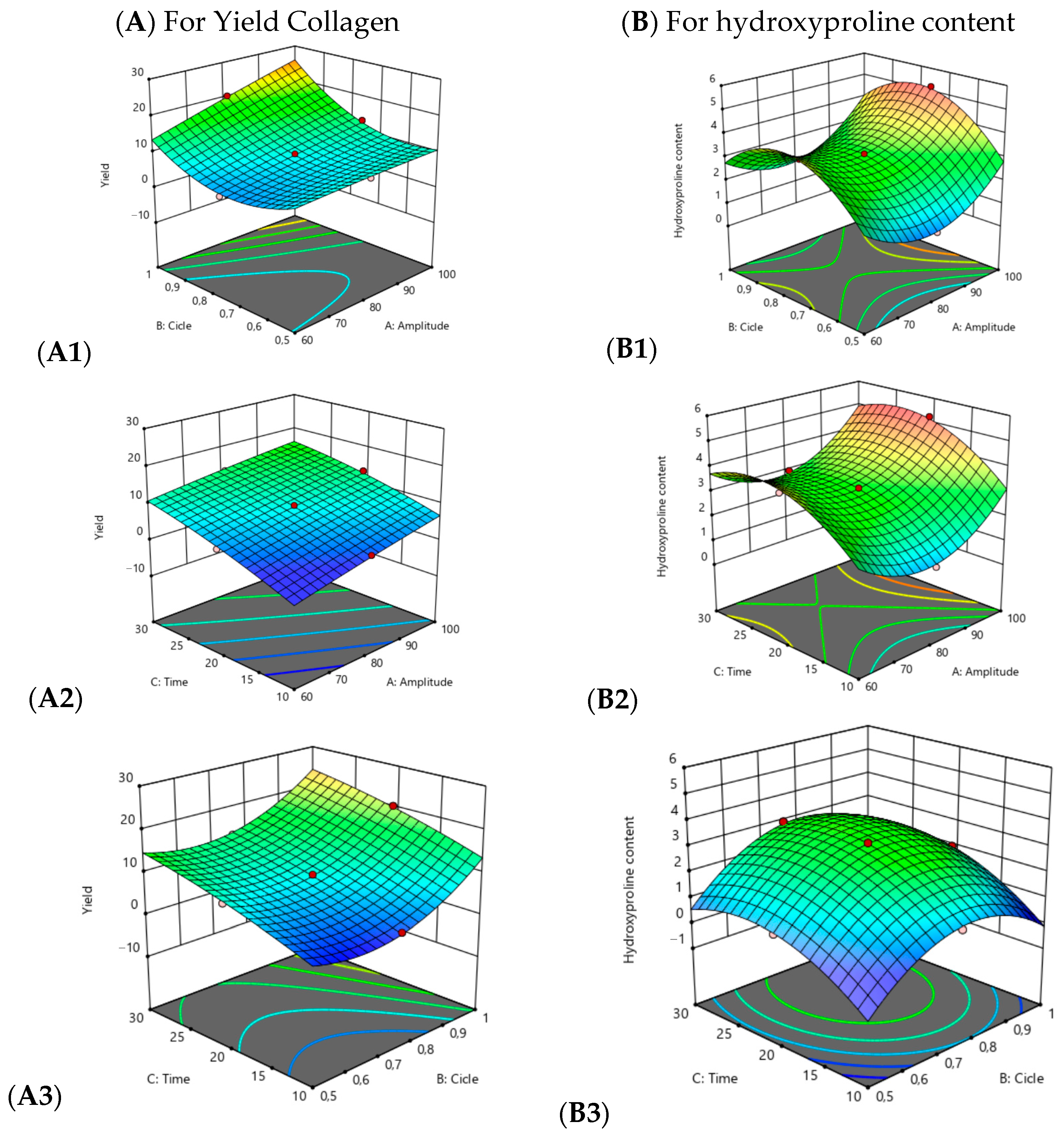 3.1.2. Interaction Effects of Process Parameters on Yield and Hydroxyproline Content in Ultrasound-Assisted Extraction