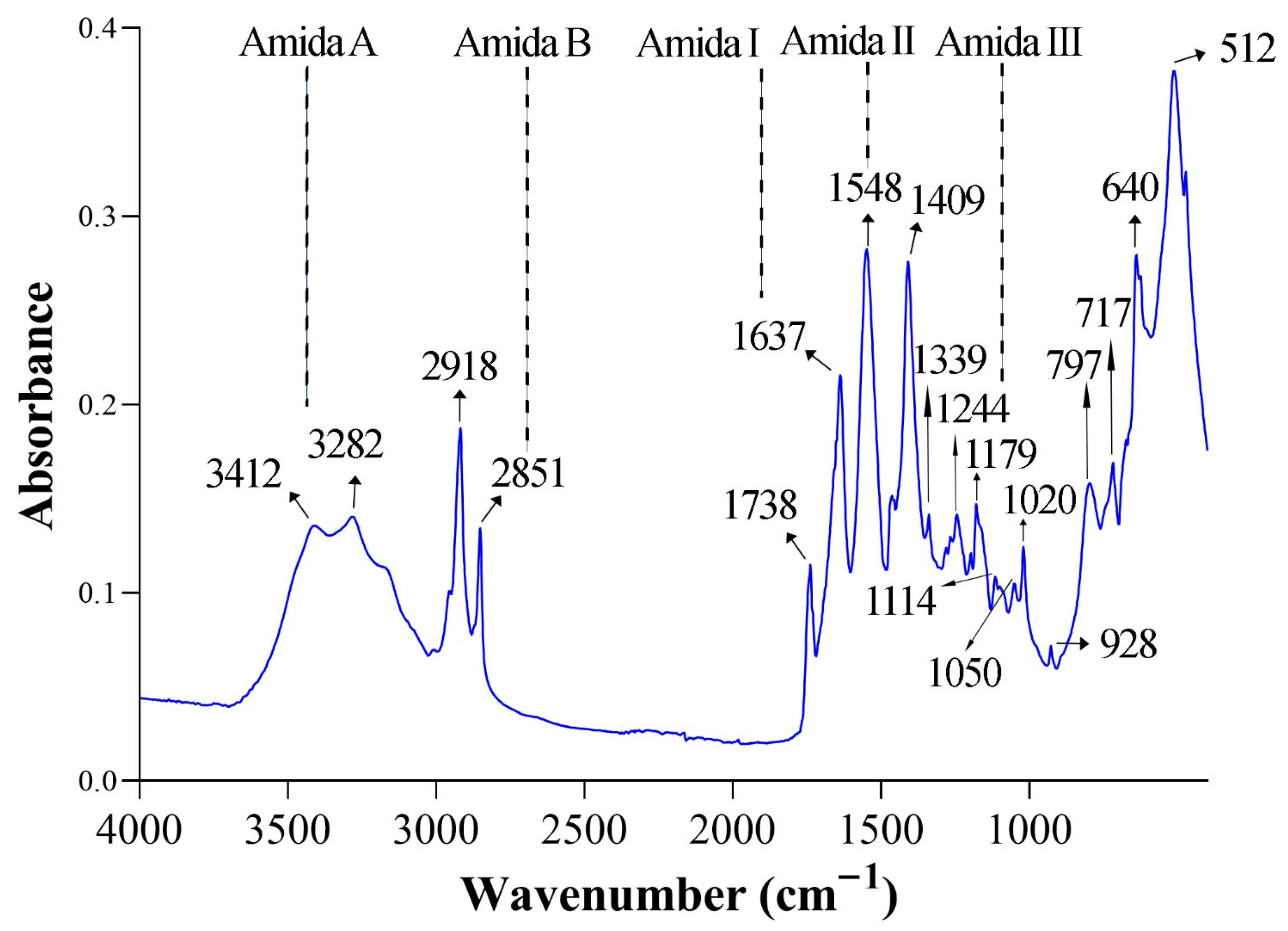 | 3282 | 3282 | Amid A–Streching N–H2 | Indicates extra reinforcement of H bonds with the peptide skeleton. | [21] |
