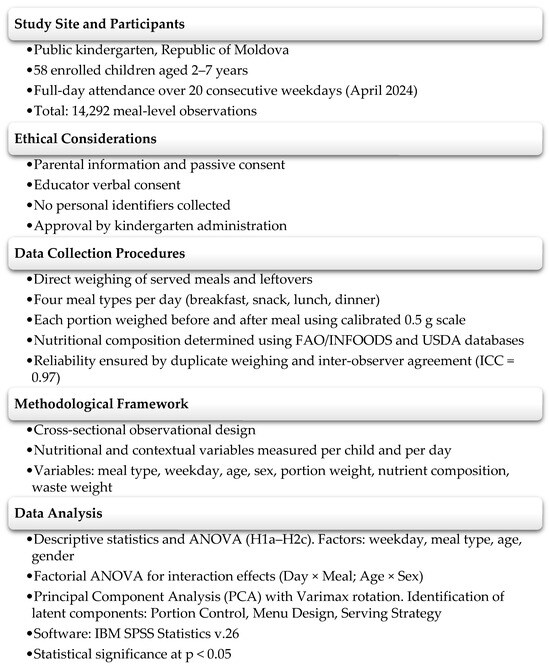 This research followed a cross-sectional observational design, conducted in a single kindergarten located in the Republic of Moldova, aiming to quantify PFW and identify its contextual, nutritional, and demographic determinants under serving and educational conditions (Figure 1). All statistical analyses were performed using IBM SPSS Statistics v.26, following a structured approach designed to test the research hypotheses (H1a–H2c).