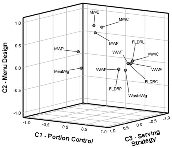 Variables cluster into distinct groups: waste and requirement-adjusted indicators align strongly with Portion Control, nutritional composition indicators align with Menu Design, while portion size and protein indicators align with Serving Strategy. This separation demonstrates that PFW is not the product of a single cause but emerges from three distinct but interacting processes: too much food served, menus that are not fully aligned with children’s preferences, and serving norms that do not match children’s eating behaviors.