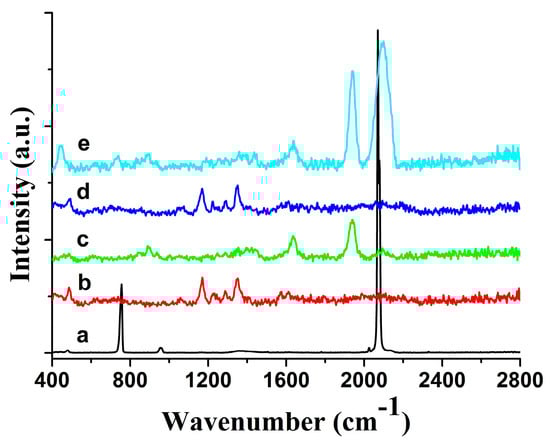Raman spectra of sodium thiocyanate on an agarose microchip. (a) Normal Raman spectrum of the sodium thiocyanate powder; (b) normal Raman background spectrum of the agarose microchip; (c) normal Raman spectrum of the agarose microchip-based substrate; (d) 5 × 10−6 g per milliliter sodium thiocyanate on the agarose microchip; (e) surface-enhanced Raman spectroscopy spectrum of 5 × 10−6 g per milliliter sodium thiocyanate on the microchip-based substrate [26].