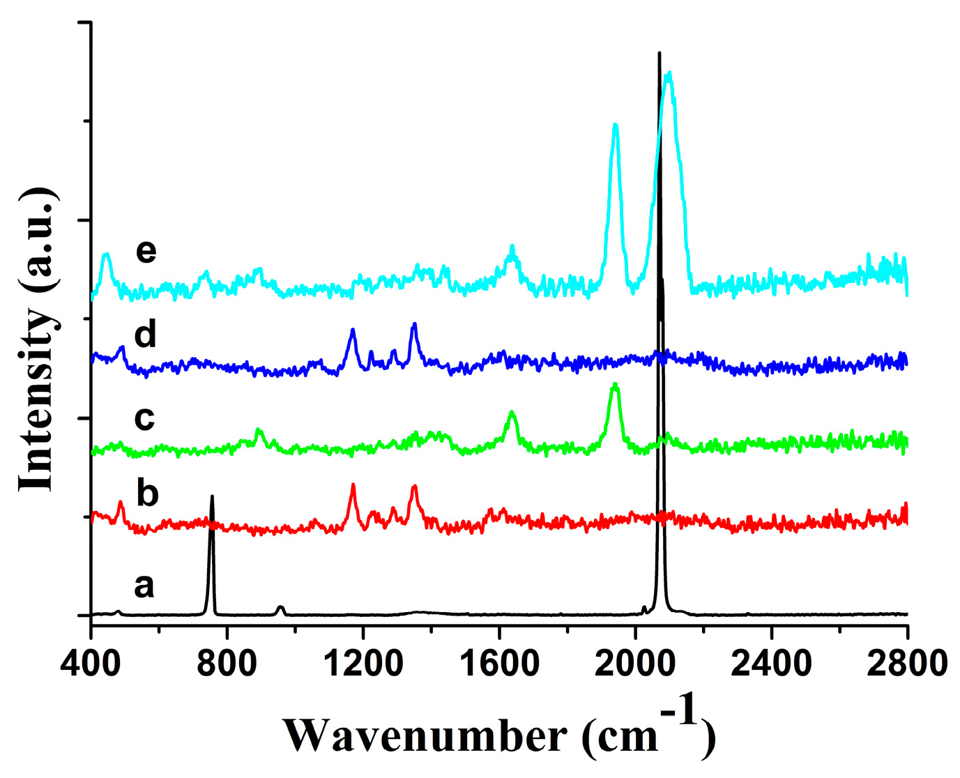 Figure 1. Raman spectra of sodium thiocyanate on an agarose microchip. (a) Normal Raman spectrum of the sodium thiocyanate powder; (b) normal Raman background spectrum of the agarose microchip; (c) normal Raman spectrum of the agarose microchip-based substrate; (d) 5 × 10−6 g per milliliter sodium thiocyanate on the agarose microchip; (e) surface-enhanced Raman spectroscopy spectrum of 5 × 10−6 g per milliliter sodium thiocyanate on the microchip-based substrate [26].