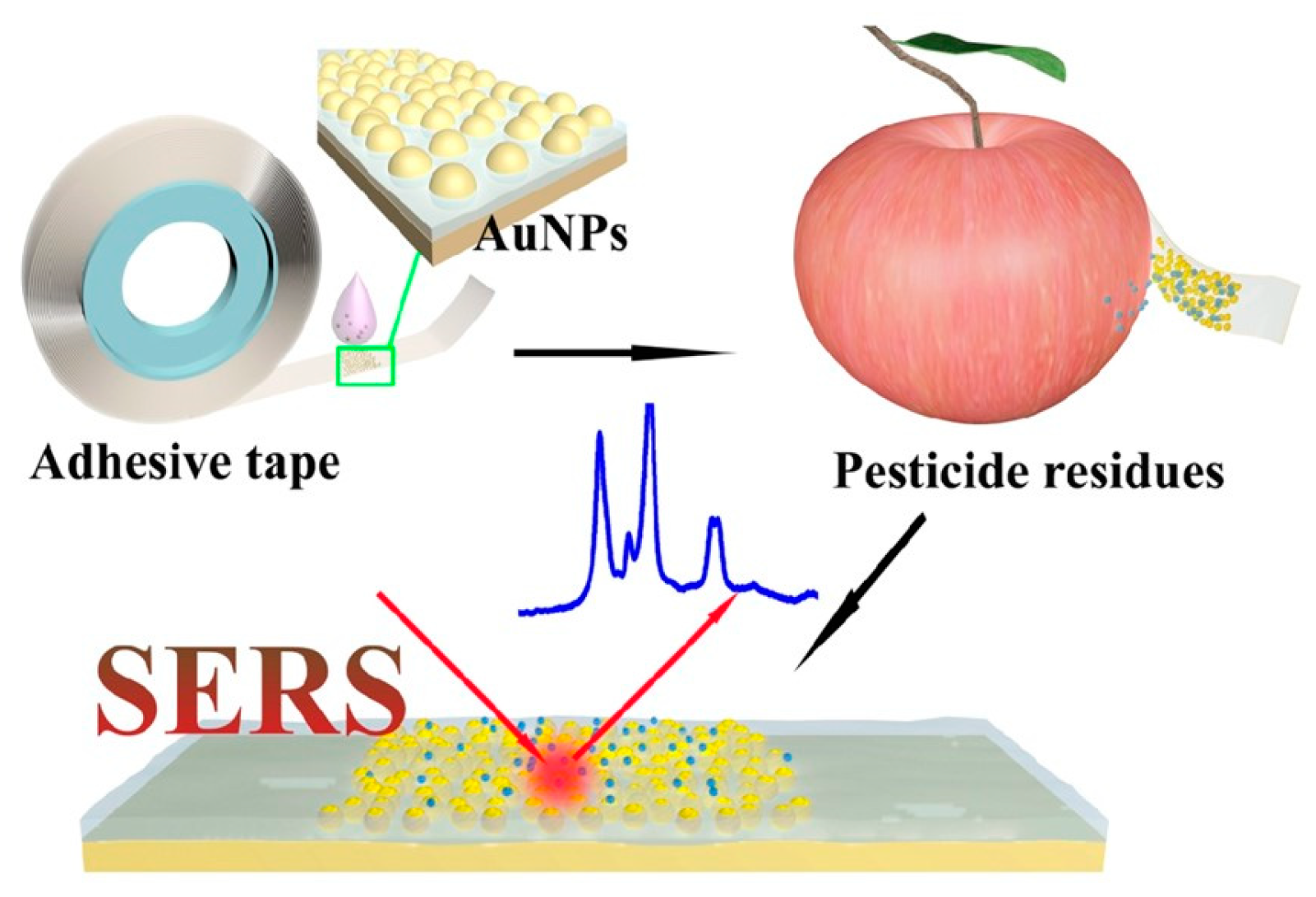 Figure 2. Schematic illustration of the fabrication of SERS tape and extraction of targets from fruit peel surface (apple) for SERS analysis. Adapted with permission from the American Chemical Society and the original author [58].