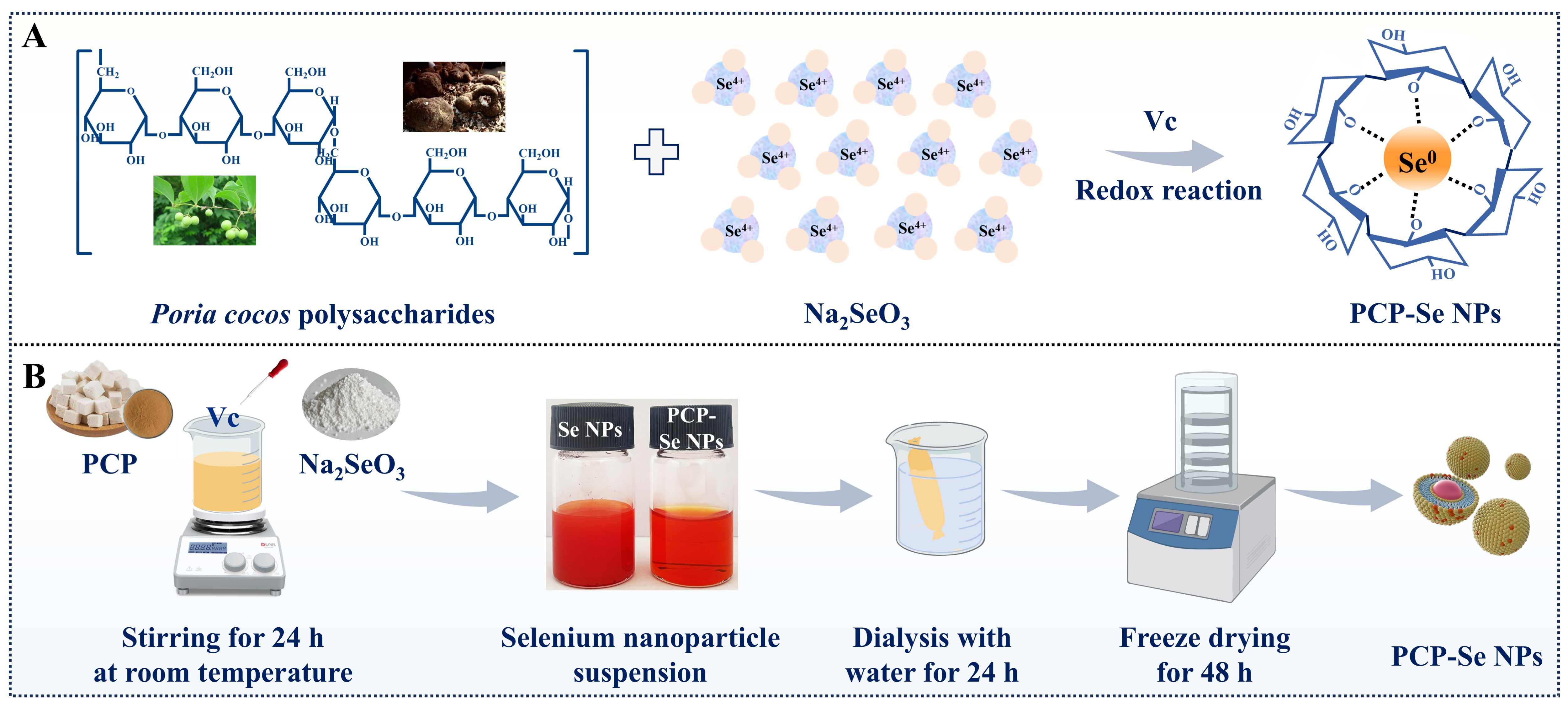 Chicago/Turabian StyleShu, Tao, Fan Li, Jiang-Ning Hu, and Yu Xu. 2025. "Poria cocos Polysaccharide-Modified Selenium Nanoparticles: Structural Characterization, Stability, and In Vitro Antioxidant and Anti-Inflammatory Activity Studies" Foods 14, no. 20: 3555. https://doi.org/10.3390/foods14203555