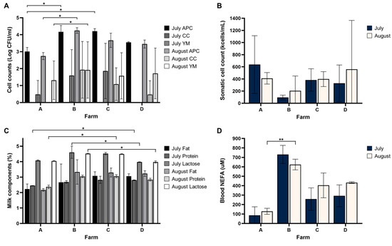 Microbiological and quality assessments of raw milk samples collected from farms A, B, C, and D in July and August. (A) Plate counts, including aerobic plate count (APC), coliform count (CC), and yeast and mold (YM), for each farm. (B) Somatic cell counts (SCC), showing variations between July and August for each farm. (C) Milk components, including true protein, fat, and lactose levels. (D) Blood non-esterified fatty acids (NEFA) concentrations in raw milk. Error bars represent the standard deviation of triplicate measurements. Asterisks indicate significant differences between farms based on Kruskal–Wallis tests followed by Dunn’s post hoc test with multiple comparison adjustment. *, p < 0.05; **, p < 0.01.