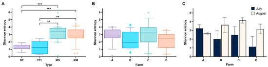 Alpha diversity (Shannon index) of microbial communities across various sample types, locations, and collection periods. (A) Alpha diversity across different sample types: bulk tank (BT), teat cup liner (TCL), milking stanchion (MS), and raw milk (RM), highlighting variation in microbial richness and evenness among these categories. (B) Alpha diversity comparison between locations, including all samples (raw milk and environmental samples combined). (C) Alpha diversity of raw milk samples collected in July and August, illustrating seasonal variations in microbial diversity. Error bars represent standard deviations, indicating variability within each category. Asterisks indicate significant pairwise differences among sample types based on Kruskal–Wallis tests followed by Dunn’s post hoc test with multiple comparison adjustment. **, p < 0.01; ***, p < 0.001.