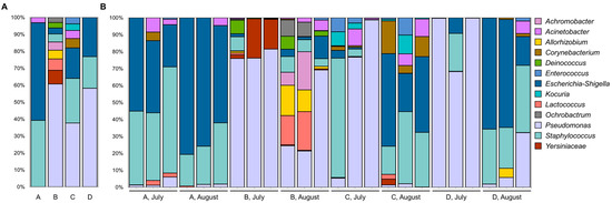 Relative abundance of seven major pathogenic bacteria identified in raw milk samples from different farms during (A) July and (B) August. Each bar represents the percentage of a specific pathogenic bacterial group within the sample, illustrating seasonal and farm-level variations in microbial composition.