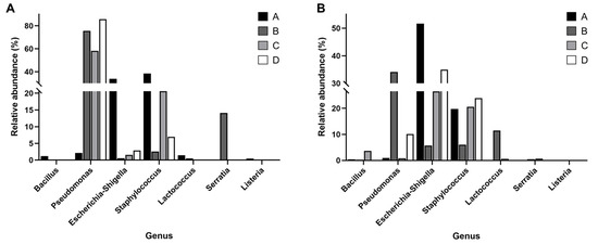 A total of 611 taxonomic groups were identified at the genus level across all raw milk and environmental samples. Farm A’s microbiota was dominated by Staphylococcus and Escherichia, with no presence of Pseudomonas. In contrast, farm B had a higher abundance of Pseudomonas along with notable amounts of Yersiniaceae, Lactococcus, and other taxa. Farm C exhibited significant proportions of Staphylococcus and Escherichia, with smaller amounts of Acinetobacter and Corynebacterium. Farm D was characterized by a large proportion of Pseudomonas and Staphylococcus, with fewer additional taxa (Figure 3A).