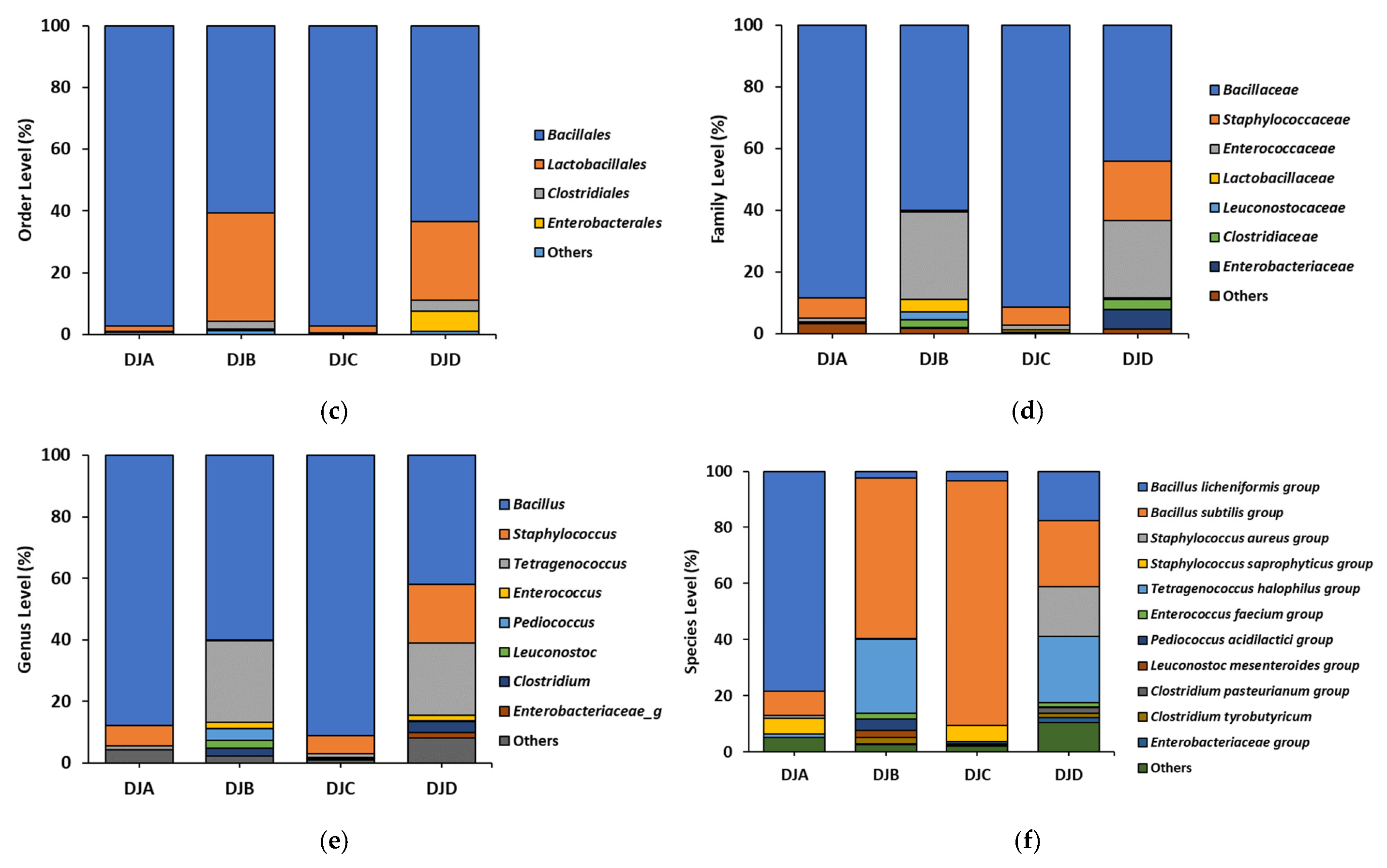 - Jo, E.; Lee, H.; Song, Y.; Cha, J. Taxonomic variations of bacterial and fungal communities depending on fermentation temperature in traditional Korean fermented soybean food, Doenjang. J. Microbiol. Biotechnol. 2024, 34, 863–870. [Google Scholar] [CrossRef]