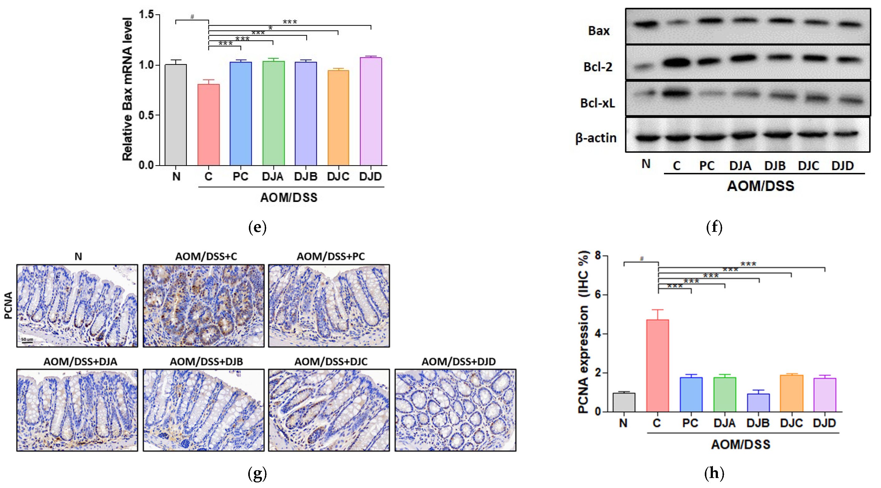 3.3. Doenjang Suppresses Tumor Growth by Regulating Apoptosis and Proliferation in CAC Mice