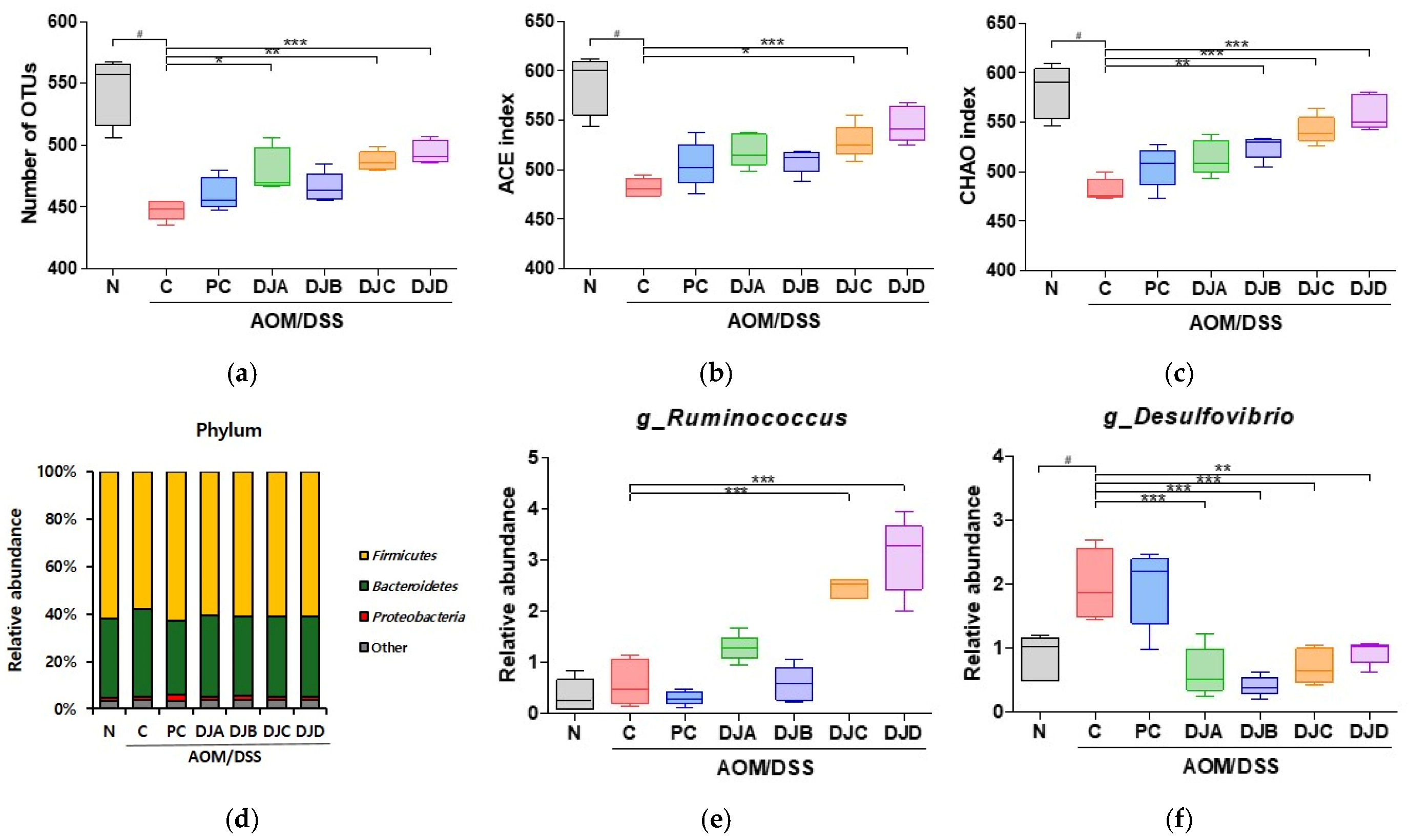3.6. Doenjang Modulates Gut Microbiota Composition and Diversity in CAC Mice