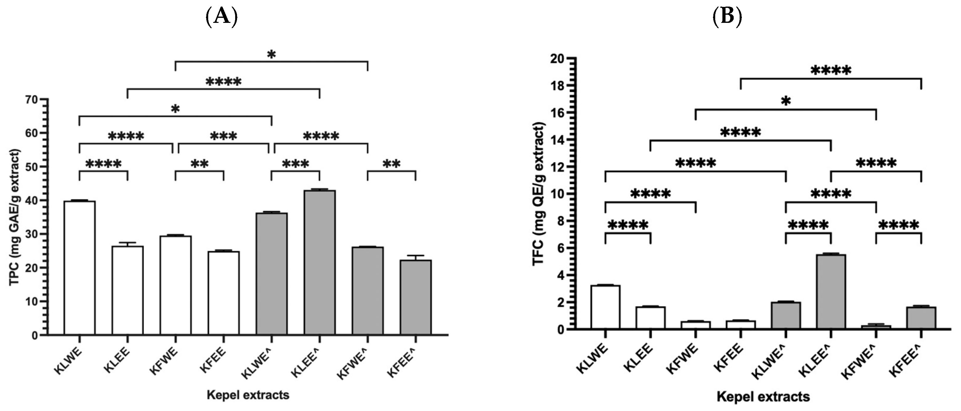 3.3. Total Phenolic and Flavonoid Contents in Kepel Extracts