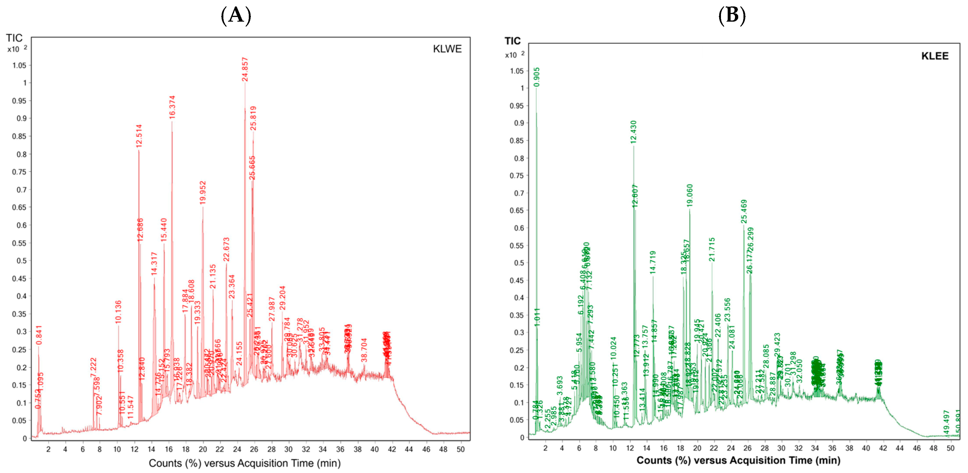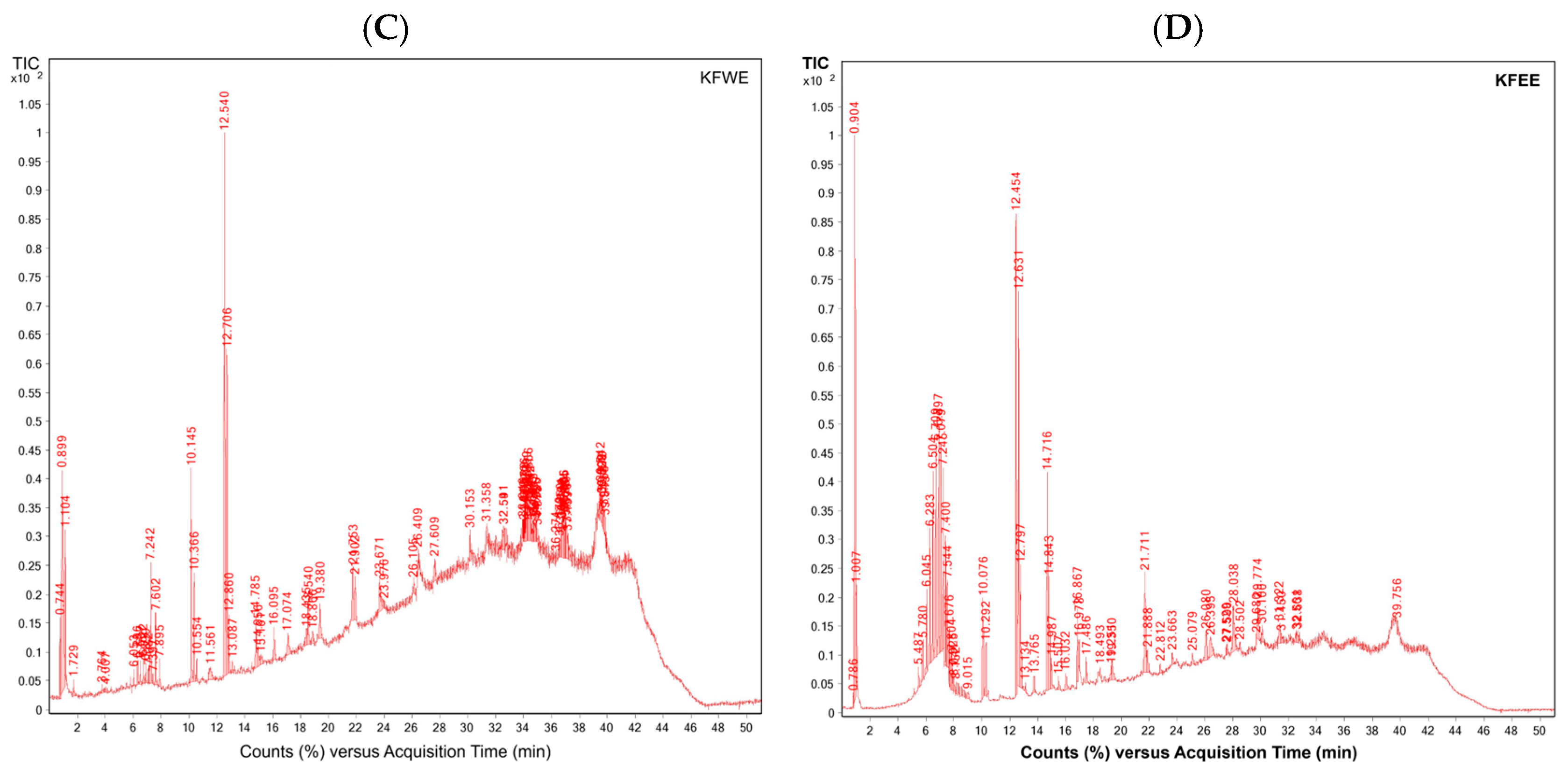 Time (min) | KLWE (mg/g) | KLWE^ (mg/g) | KLEE (mg/g) | KLEE^ (mg/g) | KFWE (mg/g) | KFWE^ (mg/g) | KFEE (mg/g) | KFEE^ (mg/g) |