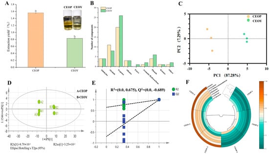 (A) Extraction yield of the essential oils from different parts (p < 0.05); (B) Types and number of volatile components of cinnamon essential oils from different parts; (C) PCA plot of two cinnamon essential oils; (D) OPLS-DA plot of cinnamon essential oils from different parts; (E) 200 cross permutation tests analysis diagram; (F) Heatmap of differential aroma components between essential oils of different parts of cinnamon (OVA ≥ 1, p < 0.05).