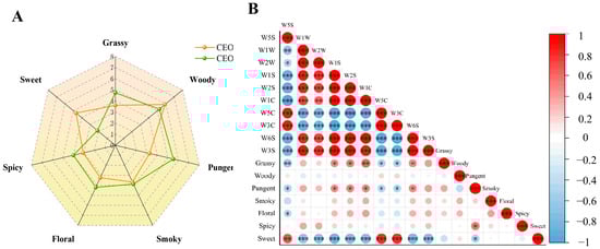 (A) Radar plots of the scores of two cinnamon essential oils evaluated for sensory characteristics; (B) Pearson correlation analysis of electronic nose and sensory evaluation of two cinnamon essential oils. * p ≤ 0.05, ** p ≤ 0.01, *** p ≤ 0.001.