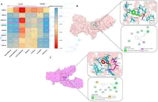(A) The binding energy of key volatile compounds in cinnamon essential oil to six ORs, TRPA1 and TRPV1; (B) simulation results for molecular docking between cinnamaldehyde and TRPA1; (C) TRPV1. CEOP: cinnamon bark essential oil, CEOY: cinnamon leaves essential oil.