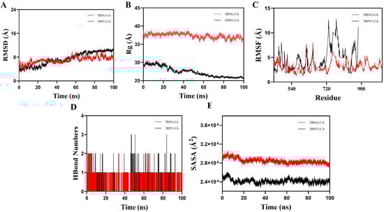 Molecular dynamics simulations provide a detailed description of the dynamic interactions between aromatic compounds and receptors at the molecular level, revealing temporal evolution over various time scales [46]. Molecular dynamics provides a more comprehensive understanding of the binding process than the static interactions observed in energy-minimized ligand–receptor complexes during molecular docking [25]. In order to elucidate the specific interaction mechanisms of cinnamaldehyde with TRPA1 and TRPV1, molecular dynamics simulations were conducted on the complexes formed between cinnamaldehyde and these spicy sensory receptors, exploring their binding states at the molecular level.