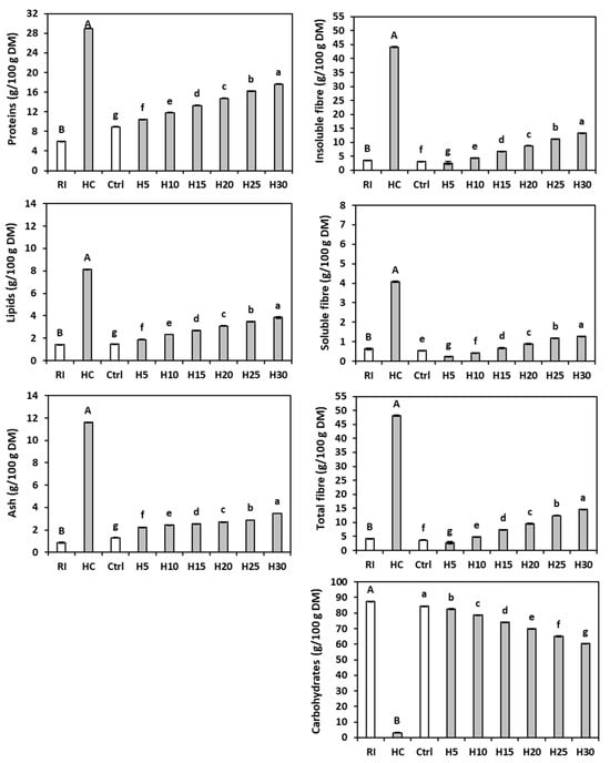 Chemical composition of rice (RI), hemp cake meal (HC), gluten-free control bread (Ctrl), and gluten-free breads enriched with 5% (H5), 10% (H10), 15% (H15), 20% (H20), 25% (H25), or 30% (H30) hemp cake meal. The bars represent the standard deviation. Different letters indicate statistical differences (p < 0.05) between flours (upper case) or among breads (lower case) following Fisher’s LSD test.