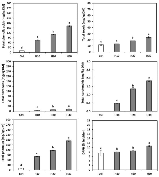 Antioxidants content (mg/kg DM) and antioxidant capacity (DPPH) of gluten-free sourdough control bread (Ctrl) and gluten-free sourdough breads enriched with 10% (H10), 20% (H20), or 30% (H30) hemp cake meal. The bars represent the standard deviation. Different letters indicate statistical differences (p < 0.05) between flours (upper case) or among breads (lower case) following Fisher’s LSD test.