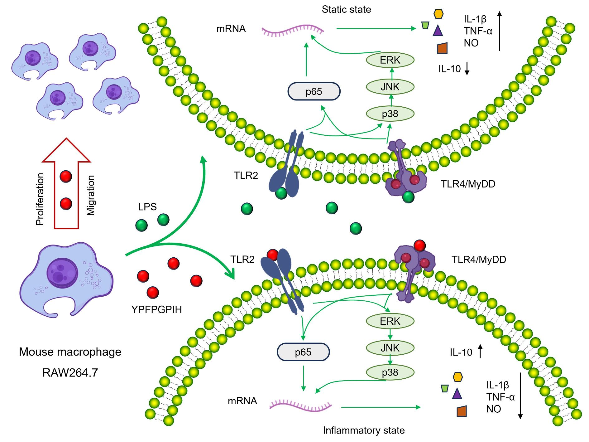 Zhang, J.; Zhang, X.; Mu, G.; Wu, X.; Wu, J. Bovine β-Casein Peptide YPFPGPIH Regulates Inflammation and Macrophage Activity via TLR/NF-κB/MAPK Signaling. Foods 2025, 14, 3572. https://doi.org/10.3390/foods14203572