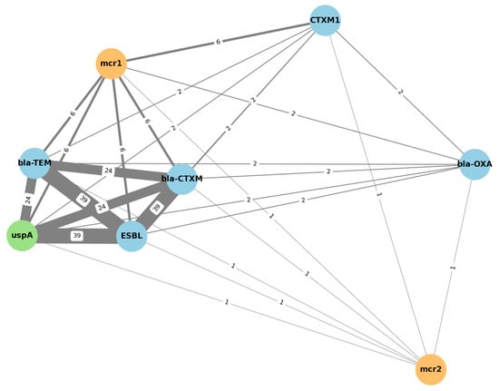 Clustered co-occurrence network of resistance genes. Blue: ESBL-related genes; orange: colistin resistance genes; green: E. coli marker gene. The numbers displayed along the connecting lines indicate the number of isolates in which both genes co-occurred. Thicker lines represent stronger associations between resistance determinants.