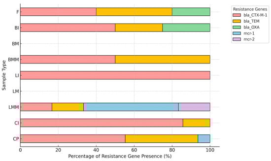 Co-occurrence analysis of resistance genes revealed distinct patterns among sample types (Figure 2). The combination of blaCTX-M and blaCTX-M-1 was most frequently detected in poultry-derived isolates (CP, CI). A co-occurrence of blaCTX-M-1 with mcr-1 was observed in lamb minced meat (LMM). In addition, co-occurrence of blaTEM and mcr-1 was detected in a limited number of isolates.