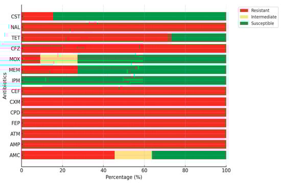 The antimicrobial susceptibility patterns of isolates demonstrated exceptionally high resistance to β-lactam antibiotics. All isolates (100%) were resistant to Ampicillin, Aztreonam, Cefepime, Cefpodoxime, Cefuroxime, Cephalothin, and Cephazolin. Resistance to Amoxicillin-Clavulanic Acid was 45.5%, while 18.2% of isolates showed intermediate susceptibility. Although Imipenem retained full efficacy (100% susceptible), Meropenem resistance was observed in 27.3% of the isolates. Resistance to Moxalactam was lower (9.1%), with 72.7% of isolates remaining susceptible. Among non-β-lactam agents, resistance to Tetracycline (72.7%) and Nalidixic Acid (100%) was strikingly high (Figure 3).