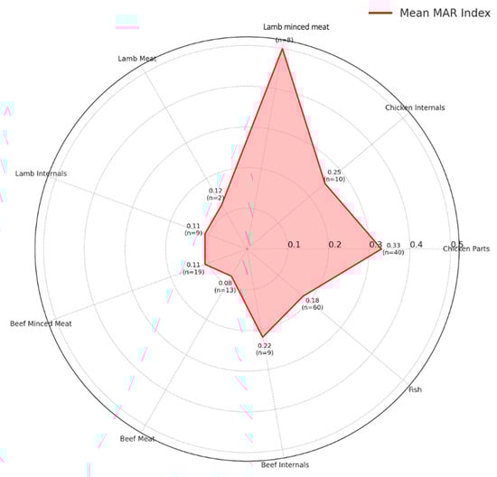 The radar plot (Figure 4) illustrates the mean MAR (Multiple Antibiotic Resistance) index for E. coli isolates obtained from various retail meat types. Each axis represents a different sample type (e.g., chicken parts, beef meat, fish, etc.). The red line shows the average MAR index for that category, while the values are also annotated numerically along with the number of isolates (n) contributing to the mean. The MAR index was calculated as the ratio of the number of antibiotics to which an isolate was resistant to the total number of antibiotics tested (n = 16 in this study). For example, an isolate resistant to 8 out of 16 antibiotics was assigned a MAR index of 0.50. This representation highlights that lamb minced meat (MAR: 0.50) and chicken parts (MAR: 0.33) harbor the highest resistance burdens, while beef meat and internals exhibit comparatively lower MAR scores.