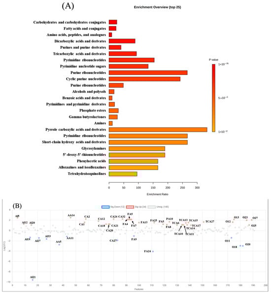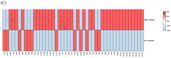 Multivariate analysis of primary metabolites (PMs) and significant differential PMs screening in ‘Huangjinya’ fresh leaves cultivated at different altitudes. (A) Pathways enrichments of all identified PMs in ‘Huangjinya’ fresh leaves harvested from two altitudes; (B) significant differential accumulated PMs (SPMs) analysis of high- and low-altitude cultivated ‘Huangjinya’ fresh leaves; (C) high- and low-altitude site-cultivated ‘Huangjinya’ fresh leaves: peak areas of SPMs (red indicates highest peak area at high elevation; blue indicates highest peak area at low elevation). Note: In total, 201 PMs were identified and named with IDs for further multivariate analysis, as shown in Table S1. AA 5, 11, and 14 were 4-guanidinobutyric acid, glutathione, and L-methionine, respectively; Al 5, 12, 19, 20, 21, 27, and 33 were adenosine 2′,3′-cyclic monophosphate, cytidine, guanosine 5′-diphospho-D-mannose, guanosine 5′-monophosphate, histamine, S-(5′-adenosyl)-L-homocysteine, and uridine 5′-diphosphogalactose, respectively; CA 1, 2, 12, 18, 20, 21, 24, 27, and 32 were 5′-deoxy-5′-(methylthio)adenosine, adonitol, D-(+)-xylose, D-mannitol, D-sorbitol, dulcitol, L-(-)-arabitol, methyl-D-galactopyranoside, and xylitol; FA 4, 5, 6, 7, 9, 13, 24, and 25 were 2-phospho-D-glycerate, 3-phospho-D-glycerate, 3-phosphoglyceric acid, 4-methy-2-oxo-pentanoic acid, D-erythro-dihydrosphingosine, glycerophosphate, sebacic acid, and sn-glycerol 3-phosphate, respectively; PA 5, 8, and 10 were 4-hydroxyphenylacetic acid, homogentisic acid, and p-coumaric acid, respectively; TCA 6, 10, 11, 13, 14, 15, 17, and 27 were beta-D-glucose 6-phosphate, D-fructose 6-phosphate, D-galactose 1-phosphate, D-glucose 1-phosphate, D-glucose 6-phosphate, D-mannose 6-phosphate, fructose-6-phosphate, and phosphoenolpyruvic acid.