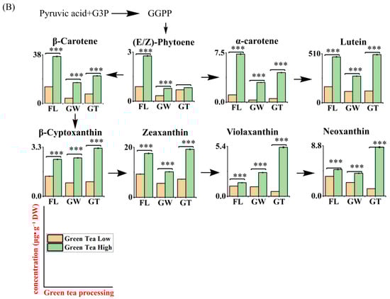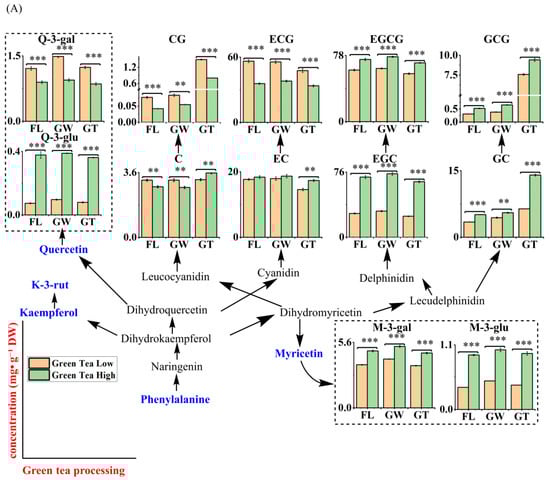 Targeted analysis of major flavonoids and carotenoids during green tea processing were applied, and the results are sorted into Tables S2 and S3. To achieve a direct view of their changes, an integrative pathway of the pigments in tea plants is presented in Figure 2. It was absolute that, during green tea processing of high-altitude leaves, major catechins such as EGCG and EGC showed a slight increase during the withering step (H_GW) before decreasing in the final product (H_GT) relative to the fresh leaves (H_FL). In contrast, minor catechins like GC and GCG increased substantially in the final tea (Table S2; Figure 2A). In detail, EGCG (73.39 to 69.35 mg·g−1 DW and 60.92 to 56.55 mg·g−1 DW in H_GT and L_GT, respectively), EGC (70.20 to 64.87 mg·g−1 DW and 27.72 to 24.48 mg·g−1 DW in H_GT and L_GT, respectively), and ECG (35.68 to 33.64 mg·g−1 DW and 56.25 to 47.60 mg·g−1 DW in H_GT and L_GT, respectively) remained at similar stable levels in GT products, with a slight increase during spreading, as shown in Figure 2A. It was interesting that GC (5.11 to 14.03 mg·g−1 DW and 3.44 to 6.42 mg·g−1 DW in H_GT and L_GT, respectively) and GCG (0.52 to 9.42 mg·g−1 DW and 0.31 to 7.57 mg·g−1 DW in H_GT and L_GT, respectively) increased sharply after the drying step. Considering the concentrations of M-3’-glu, Q-3-gal, K-3-rut, and Q-3-glu (<1.5 mg·g−1 DW), their dynamics during processing were mild.