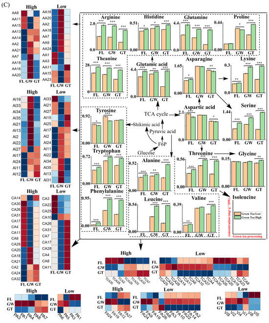 Major flavor compound dynamics illustrated in related pathways during green tea processing using two different altitudes of harvested ‘Huangjinya’ fresh leaves. (A) Crucial flavonoid (catechins) changes during green tea processing; (B) carotenoid changes during green tea processing; (C) amino acid and crucial PM changes during green tea processing. Note: FL, fresh leaves samples; GW, fresh leaves spread for 2 h and collected samples; GT, spread samples processed by fixing, rolling, and drying to make green tea products. Note: *, **, and ***, represents the significant difference that * means <0.05, ** means <0.01, and *** means <0.005.