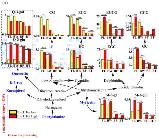 Major flavor compound dynamics illustrated in related pathways during black tea processing using two different altitudes of harvested ‘Huangjinya’ fresh leaves. (A) Crucial flavonoid (catechins) changes during green tea processing; (B) carotenoid changes during green tea processing; (C) amino acid and crucial PM changes during green tea processing. Note: FL, fresh leaves samples; BW, fresh leaves withered for 12 h and collected samples; BF, withered samples processed by rolling and fermentation; BT, fermented samples dried to make black tea products. Note: *, **, and ***, represents the significant difference that * means <0.05, ** means <0.01, and, *** means <0.005.
