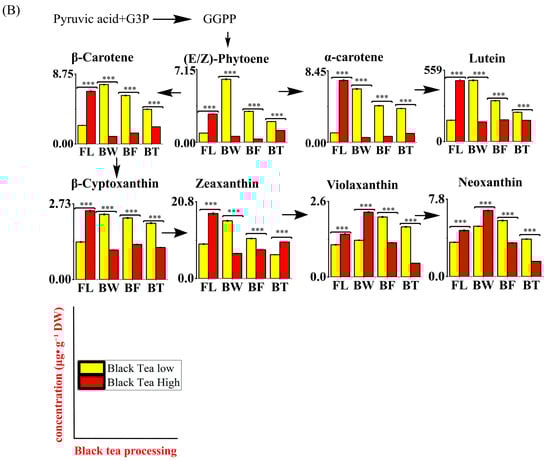Compared to green tea, carotenoids in black tea also exhibit complex accumulation patterns influenced by altitude, yet these patterns are diametrically opposed (as shown in Figure 3B). All major carotenoid individuals, especially β-carotene and lutein, showed a similar pattern during low-altitude leaves processing, which gradually increased after the spreading and drying stage from 12.97 to 24.22 and 166.35 to 229.81 μg·g−1. However, the results showed a different tendency from carotenoids originating from high-altitude site FLs during processing (Figure 3B). Carotenes, especially β-carotene (36.72 to 11.99 μg·g−1) and α-carotene (7.31 to 1.03 μg·g−1), decreased by nearly 77% in H_BT when compared to H_FLs. It was a novel finding that lutein dimyristate and zeaxanthin showed decreases in H_BT. These trends suggest that high-altitude site BT undergoes a greater oxidative degradation of pigments during prolonged fermentation.