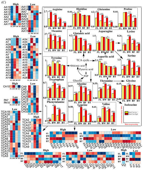 AAs and VIP > 1 PMs were selected, and their dynamics during BT crucial processing steps were monitored (Tables S1 and S7). An integrative figure was illustrated, as shown in Figure 3C. Theanine (25.96 to 13.58 mg·g−1), glutamine (4.02 to 1.21 mg·g−1), glutamic acid (4.03 to 1.57 mg·g−1), aspartic acid (1.70 to 1.06 mg·g−1), and arginine (2.57 to 0.65 mg·g−1) were the five major Aas and exhibited apparent decreases in L_BT. Opposite that, phenylalanine (0.11 to 0.45 mg·g−1) accumulated in BW and maintained higher levels the H_BT. The contents of AAs in L_FLs were lower compared to H_FLs, and their patterns of change during the processing steps were similar; however, they decreased more drastically, especially theanine (19.62 to 5.82 mg·g−1).