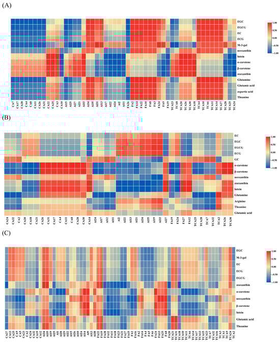In low-altitude site green tea (L_GT), 51 differential PMs were used in the analysis, including 12 carbohydrates (e.g., CA 3, 4, 8, 26, and 31); 14 alkaloids (e.g., Al 34, 35, 31, 13); 10 fatty acids (e.g., FA 9 and FA 19); and 15 TCA-related intermediates (e.g., TCA 10, 26, and 30) (Figure 4A). The five major flavonoids—EGC, EGCG, EC, ECG, and M-3-gal—showed strong positive correlations with alkaloids, particularly the synergy between M-3-gal and Al 31 (r = 0.99). They were also positively correlated with most fatty acids, except FA 26 (r = −0.91), and with tricarboxylic acid intermediates, especially EGC–TCA 10 (r = 0.96). In contrast, flavonoids were negatively correlated with most carbohydrates, with EGC and CA 4, 8, 11, 26, and 31 displaying strong opposition (r = −0.97). Carotenoids such as neoxanthin, lutein, α-carotene, β-carotene, and zeaxanthin were positively correlated with most carbohydrates, particularly CA 22, CA 25, and CA 3 (r = 0.90), but showed negative correlations with most alkaloids (Al 17, 24, and 22) and fatty acids (FA 9 and FA 19). A novel correlation was observed between lutein and TCA intermediates (TCA 20, 26, 30, and 18), while α-carotene was negatively correlated with TCA 24 and 27 (r = −0.97) but positively correlated with most other TCAs. For amino acids, glutamic acid and theanine (content > 2 mg/g) exhibited negative correlations with most carbohydrates and alkaloids and positive correlations with most fatty acids and TCA intermediates. Glutamic acid showed a strong correlation with TCA 4 (r = 0.95).