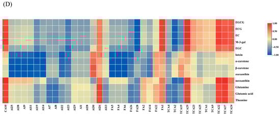 In high-altitude site black tea (H_BT), 37 metabolites were analyzed, including 1 carbohydrate (CA 10), 16 alkaloids, 9 fatty acids, and 11 TCA-related intermediates (Figure 4D). Flavonoids were negatively correlated with most alkaloids, such as EGC–Al 23 (r = −0.86), but positively correlated with CA 10 (r = 0.86) and TCA 29 (r = 0.97). They were also negatively associated with fatty acid FA 28 (r = −0.94). Carotenoids, including neoxanthin, lutein, α-carotene, β-carotene, and zeaxanthin, were generally negatively associated with alkaloids and fatty acids, particularly α-carotene–FA 4/5/6 (r = −0.99) and β-carotene–Al 38 (r = −0.99). Neoxanthin showed negative correlation with TCA 2 (r = −0.90) and positive correlation with CA 10 (r = 0.99). Major amino acids (theanine, glutamic acid, and glutamine) in H_BT were positively associated with CA 10 (r = 0.89) but negatively correlated with alkaloids, fatty acids, and TCA compounds, particularly theanine–TCA 29 (r = −0.91).