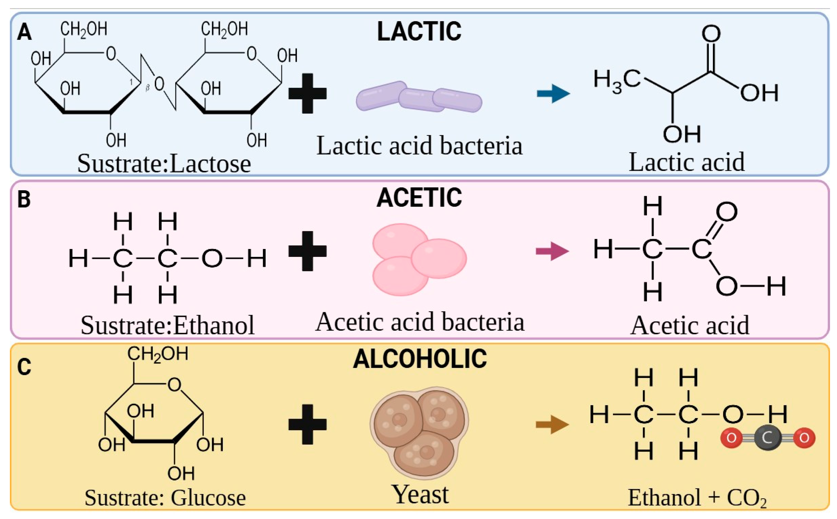 Vinegar | blueberry, persimmon, sugar cane, beer, citron, plum, dates, pomegranate, grains, soursop, cherry, kombucha, malt, mango, apple, molasses, honey, rice must, orange, pears, pineapple and its by-products, banana and papaya, whey, grape, wine | Alcoholic: 7–14 days; 18–20 °C; pH ~5.0 Acetic: 1–2 weeks; 25–40 °C; pH 5.5–7.0 | Saccharomyces spp., Acetobacter spp. | [34,75] |